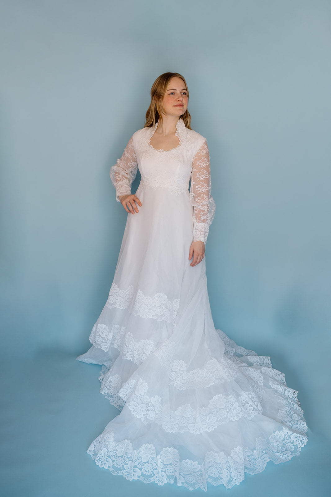 Morris: 1970s white, tiered skirt with tulle, long sleeves wedding dress
