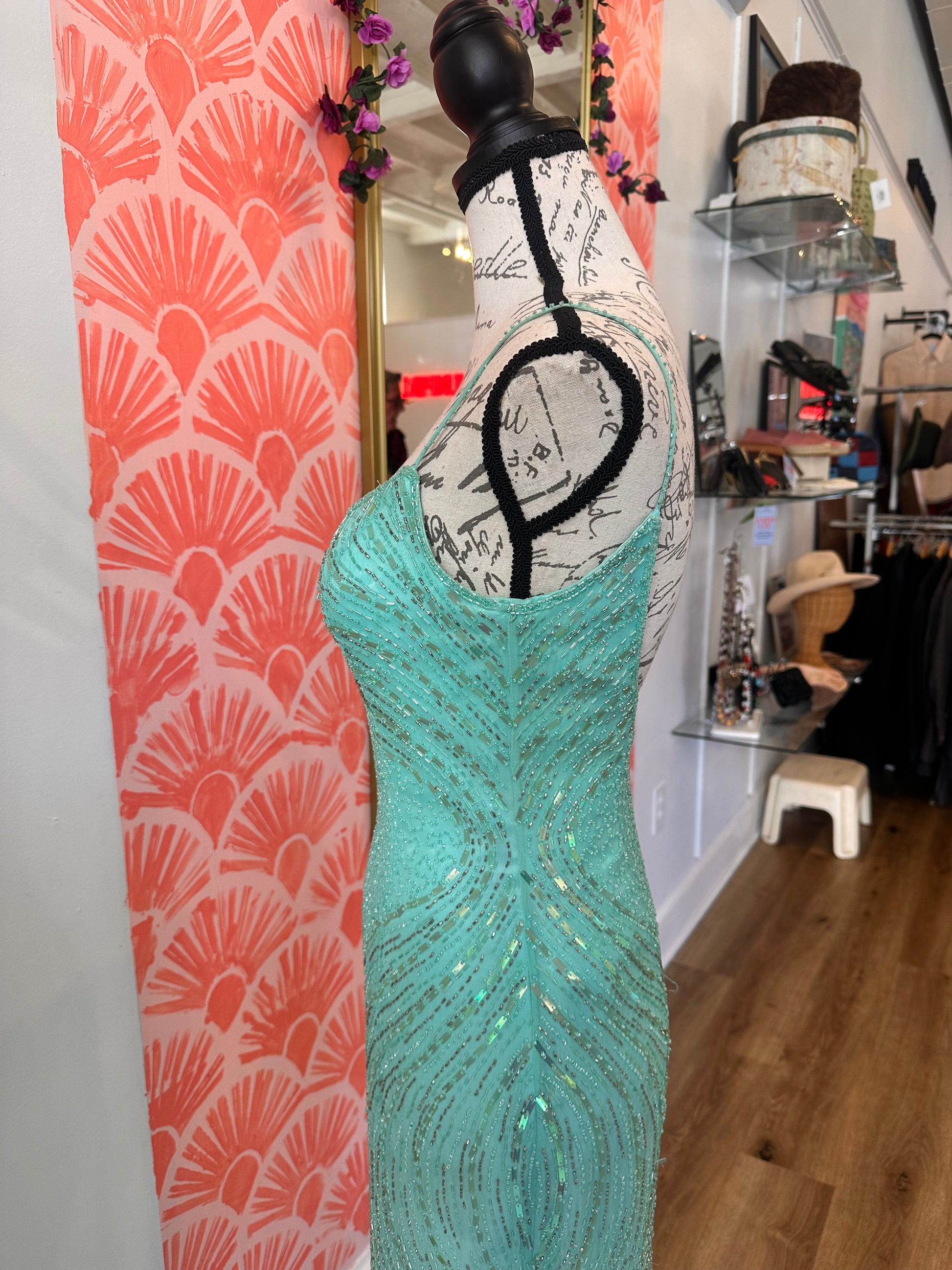 • Beautiful Teal Beaded Gown with Scarf