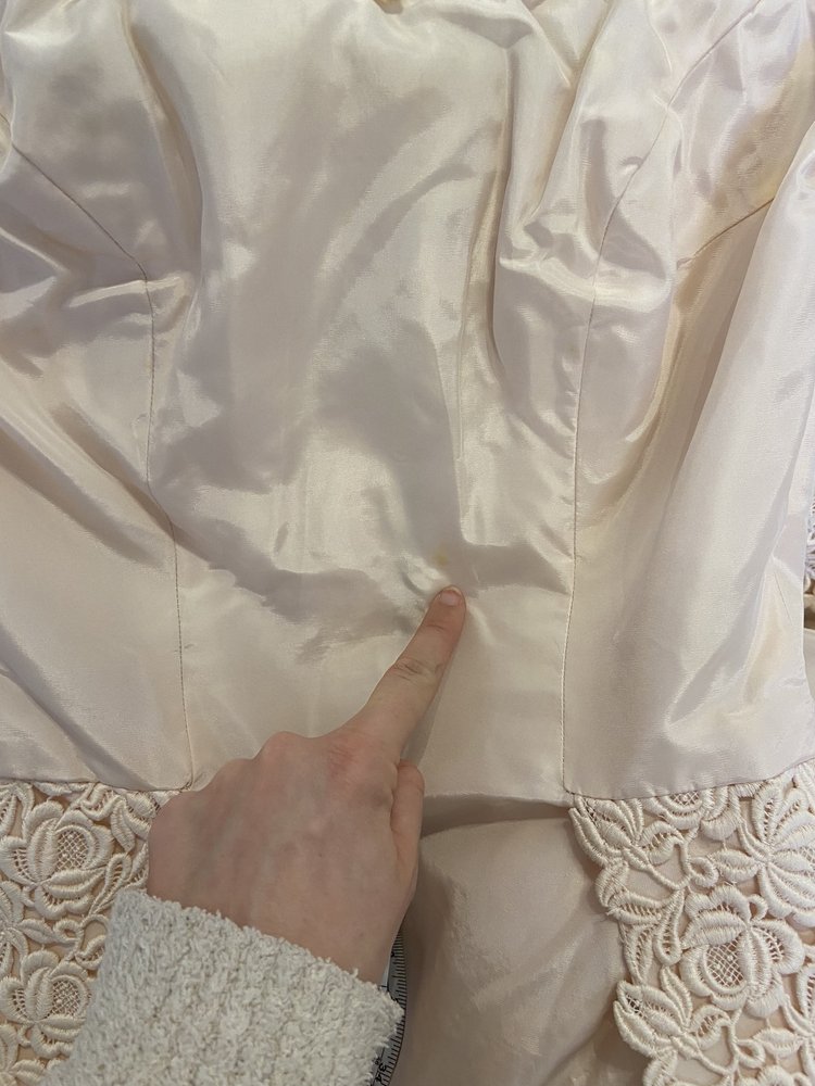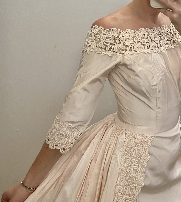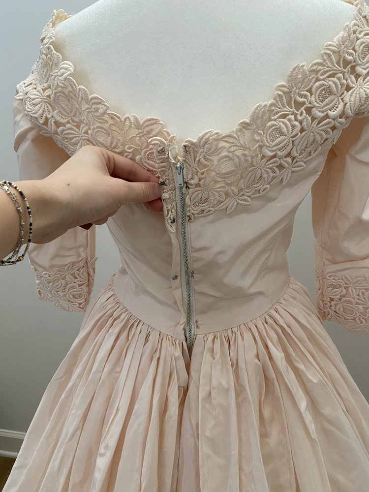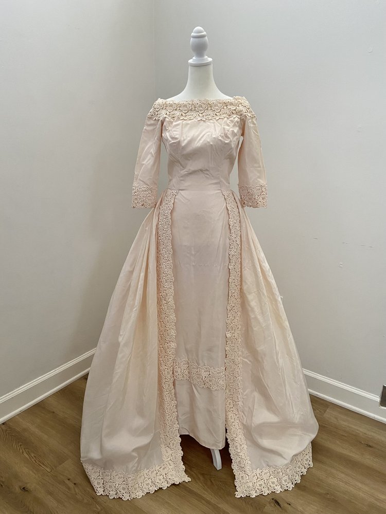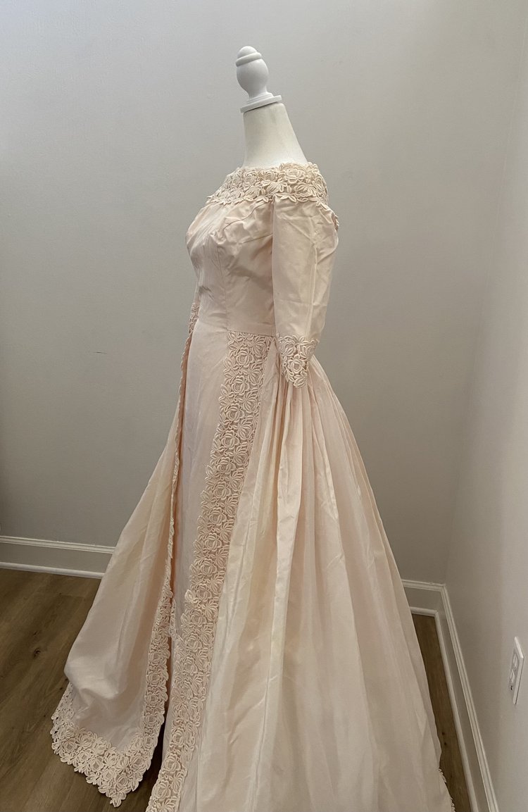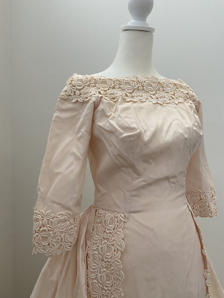 Good vintage condition with minor signs of wear consistent with the age of the item. It has been cleaned and stored in a preservation box since 1962. 2 very small age spots on the bodice.
