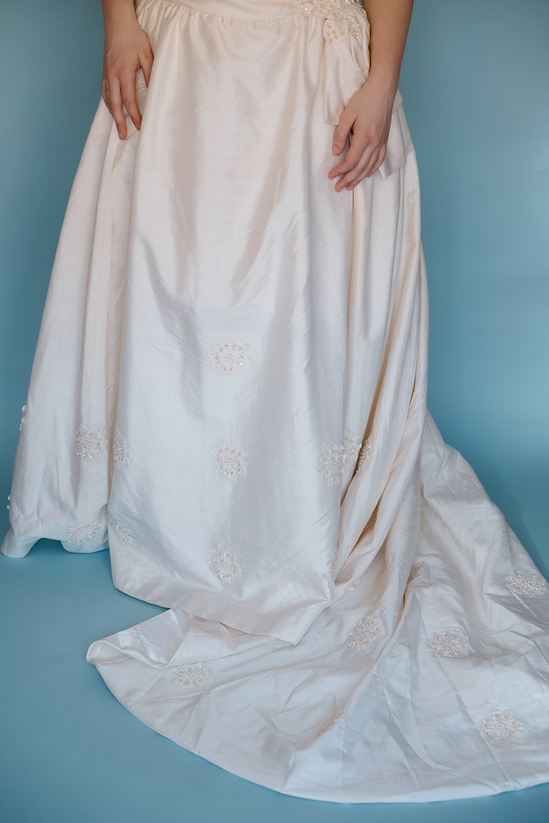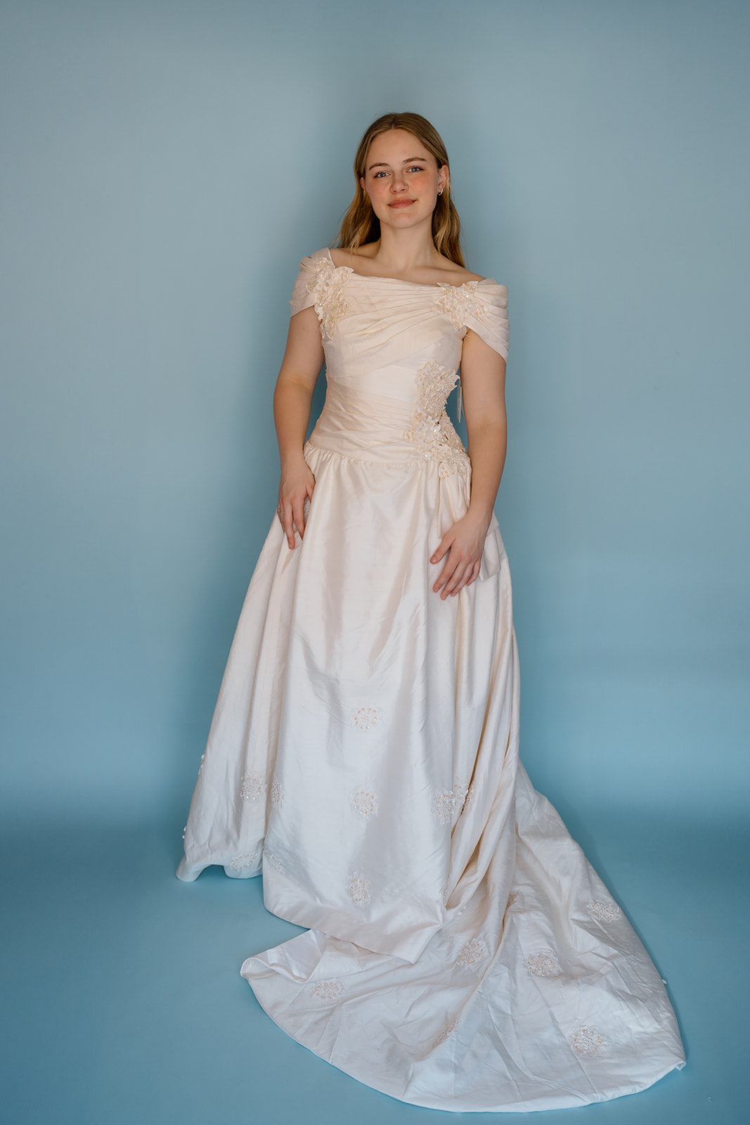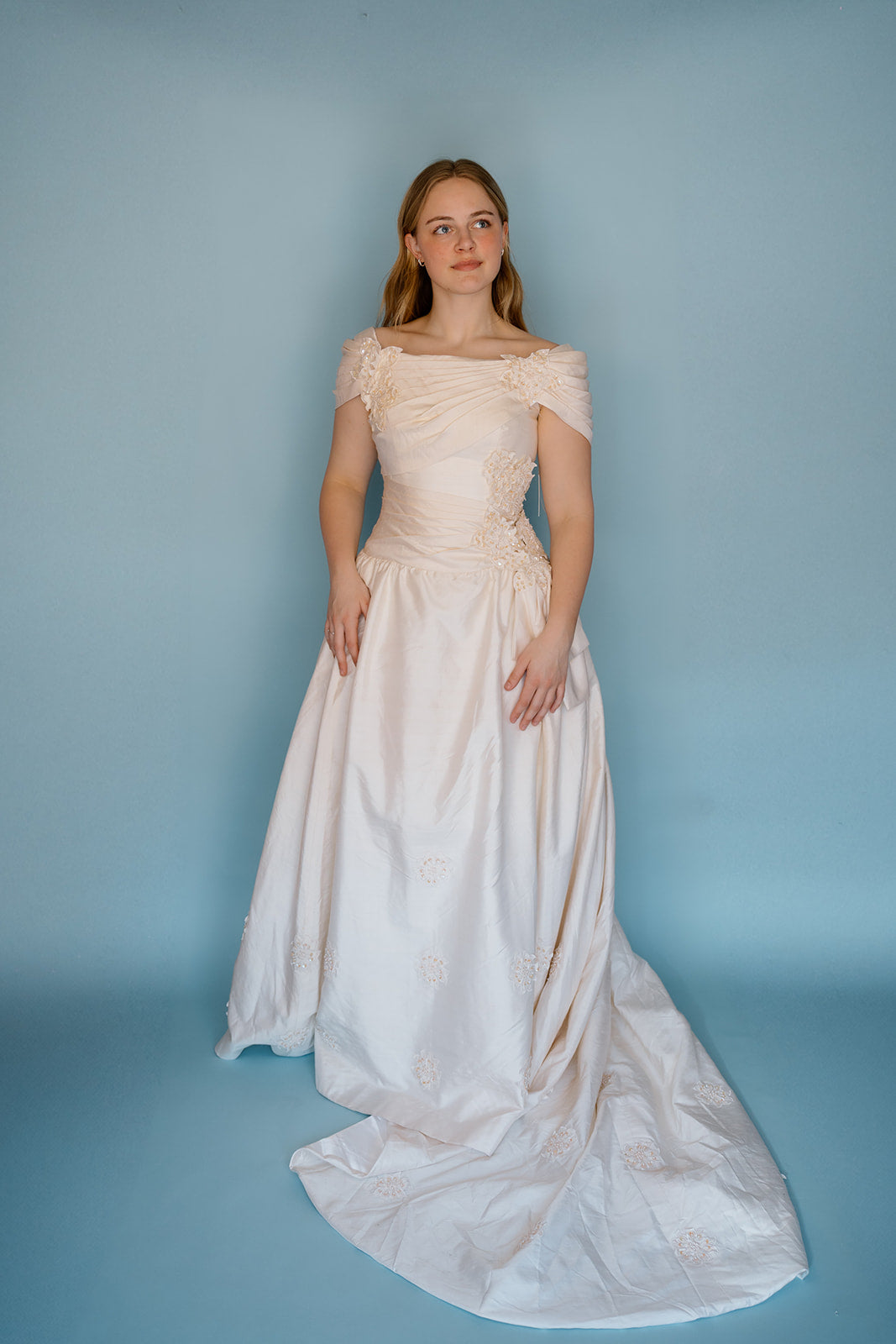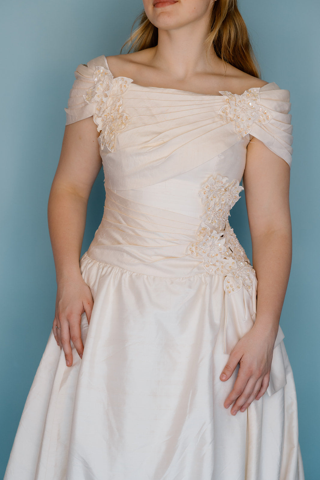 Quinn: 100% silk ivory ballgown with pearls and rouching